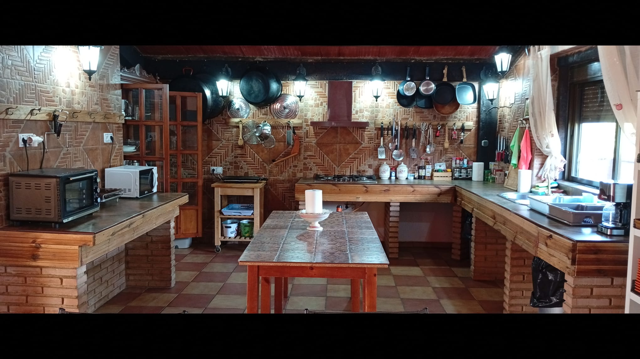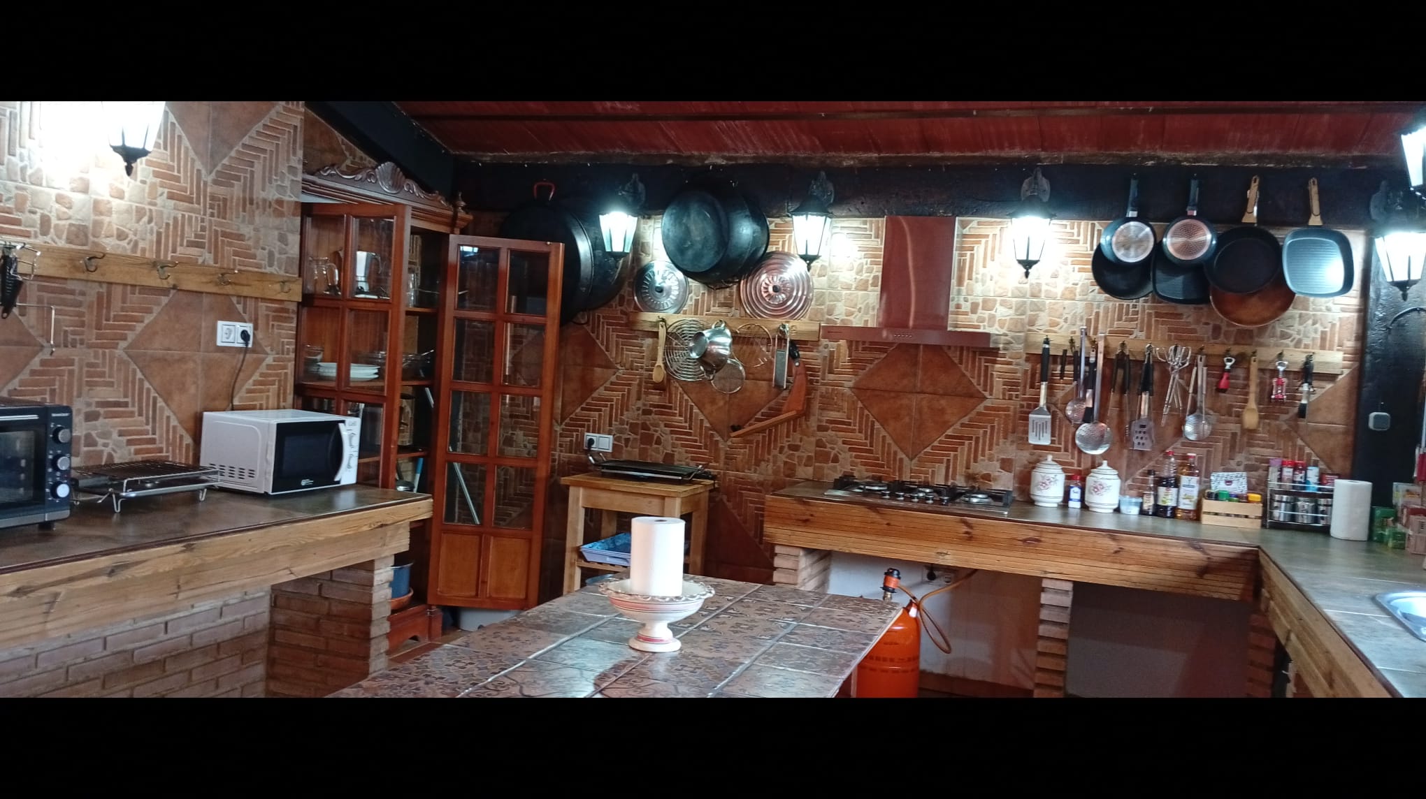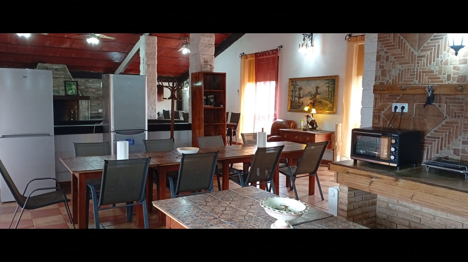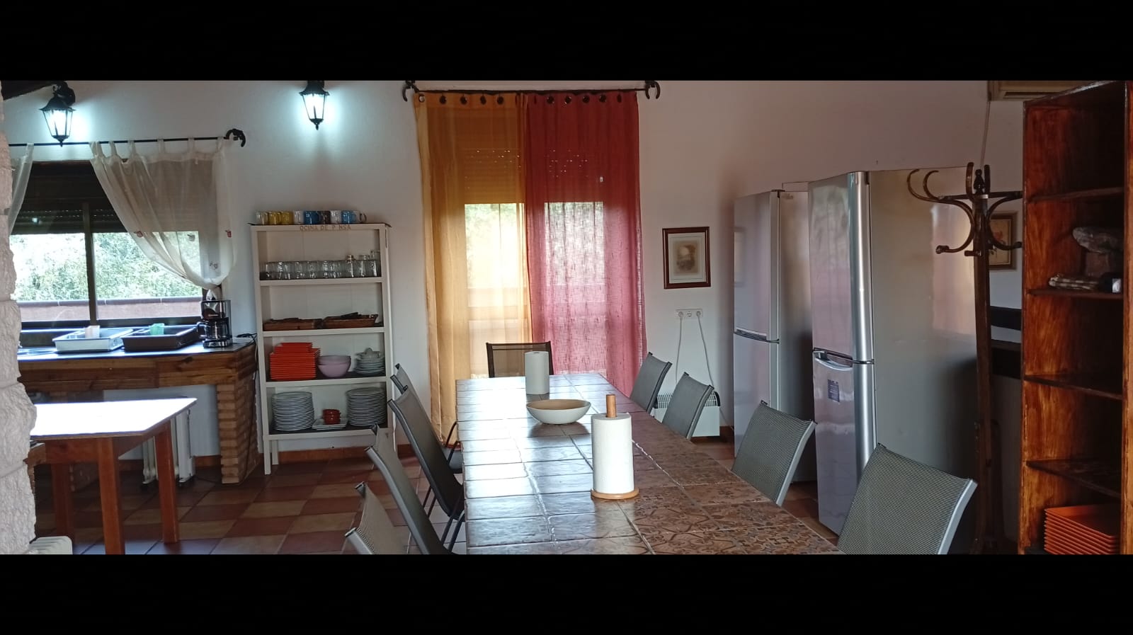 - Cocina integrada muy amplia equipada, termo eléctrico, 2 frigoríficos, placa inducción, cafetera eléctrica y tradicional, exprimidor, batidora, calentador eléctrico agua, microondas, tostadores, plancha eléctrica, pizzera eléctrica, paelleras, peroles, fuentes varias, vajilla, cubertería, manteles, aliños varios, infusiones varias etc.