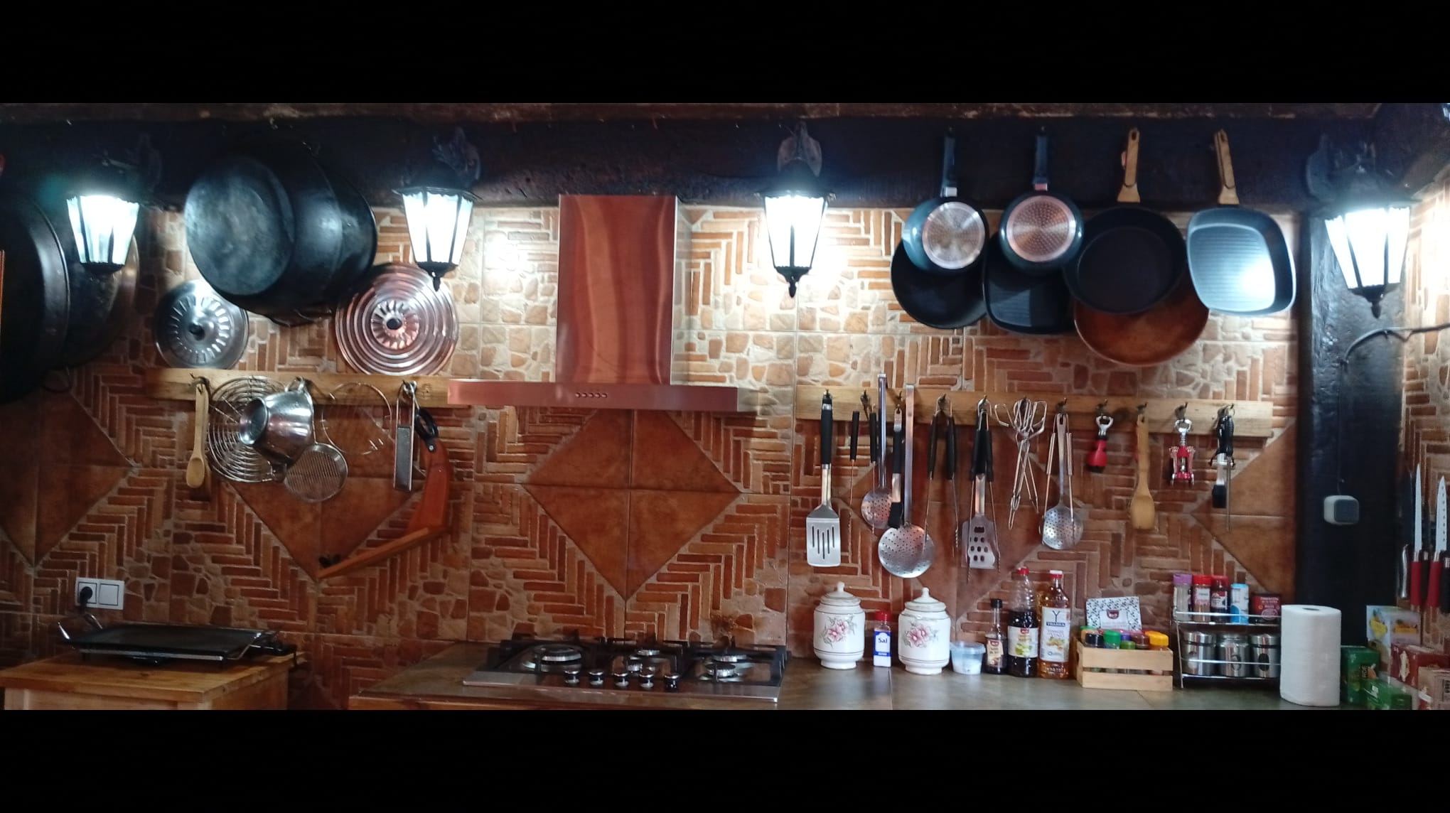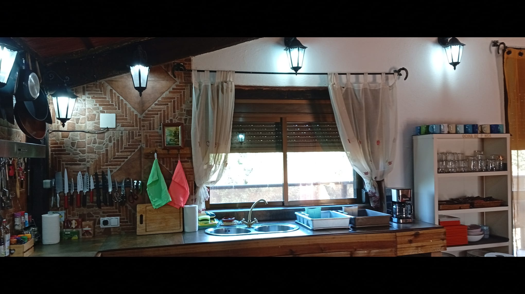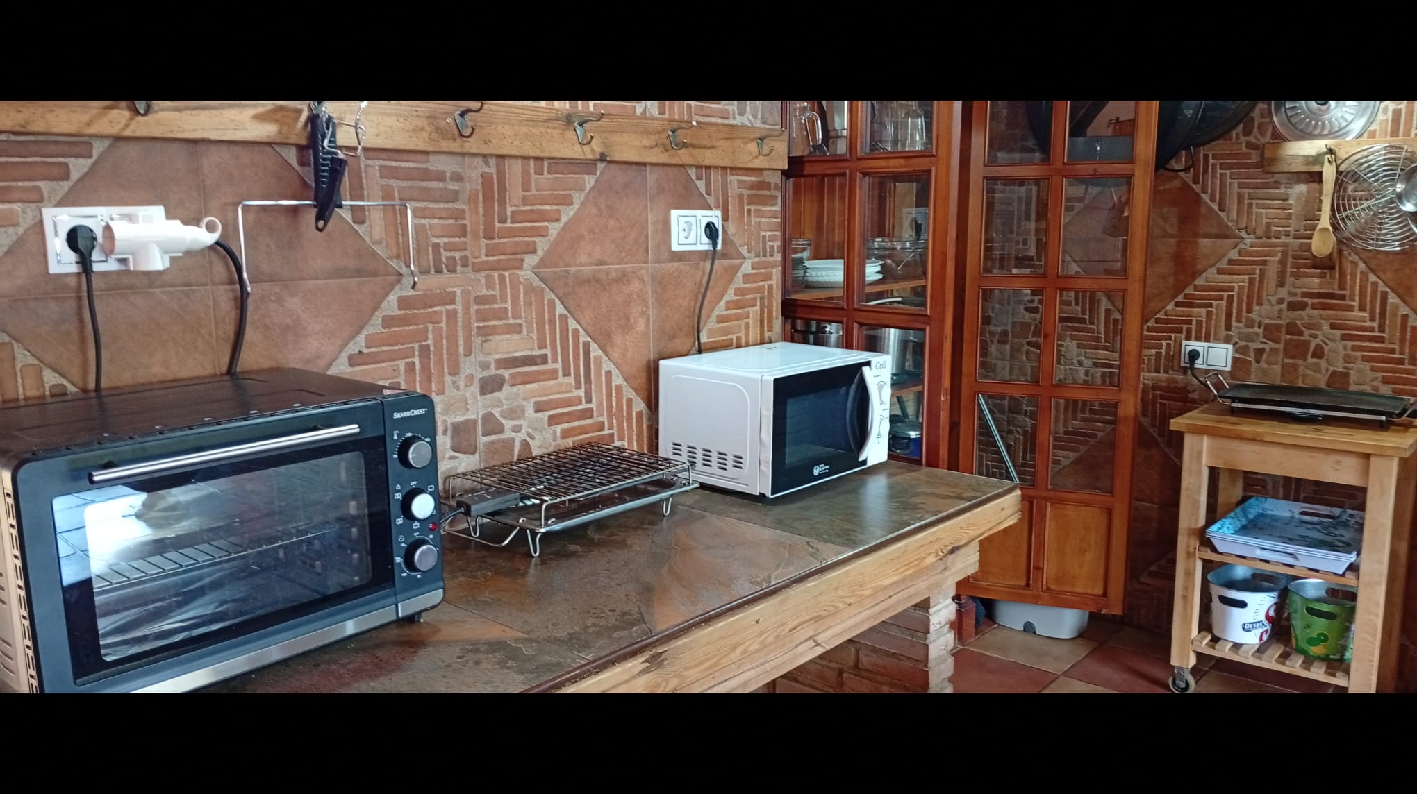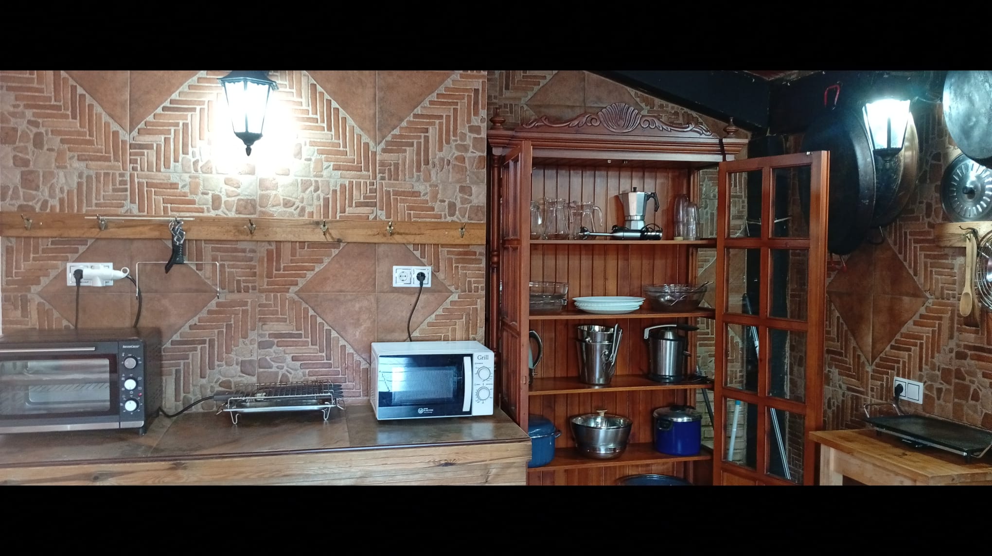 - Cocina integrada muy amplia equipada, termo eléctrico, 2 frigoríficos, placa inducción, cafetera eléctrica y tradicional, exprimidor, batidora, calentador eléctrico agua, microondas, tostadores, plancha eléctrica, pizzera eléctrica, paelleras, peroles, fuentes varias, vajilla, cubertería, manteles, aliños varios, infusiones varias etc.