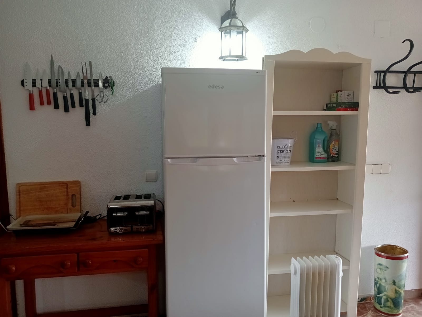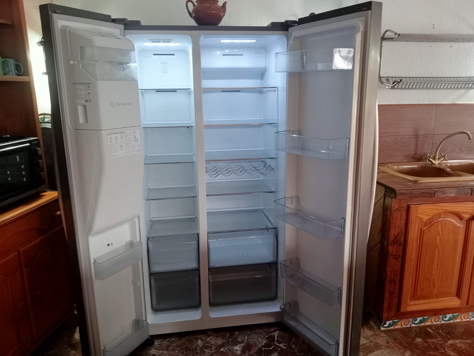 1 frigorífico americano de gran capacidad con 2 puertas, suministra hielo y agua fría. 1 horno eléctrico, 1 microondas, 1 pizzera eléctrica, 1 cafetera eléctrica, 1 exprimidor eléctrico y otro manual. Varias fuentes ovaladas y varias redondas, jarras de cristal, cubitera de acero, juego de cuchillos variado. 2 paellas medianas, 2 peroles medianos, 3 sartenes, 3 cacerolas, 15-20 vasos, 15-20 tazas. Variados utensilios de cocina y cubertería amplia.
